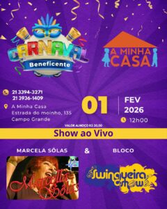 No domingo (01) a festa do Rei Momo será beneficente no Orfanato Minha Casa, na Estrada do Moinho, 135, a partir das 12hs. Marcela Sôlas e o Bloco Swingueira Show animarão a folia.