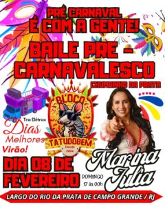 Na sequência, domingo (08), às 17hs, acontece o mais tradicional evento carnavalesco do Rio da Prata, o pré-carnavalesco Chumbinho da Prata, uma alusão ao Restaurante Empório do Chumbinho. Quem anima a galera é a cantora Marina Julia e o Bloco TatuDoBem.