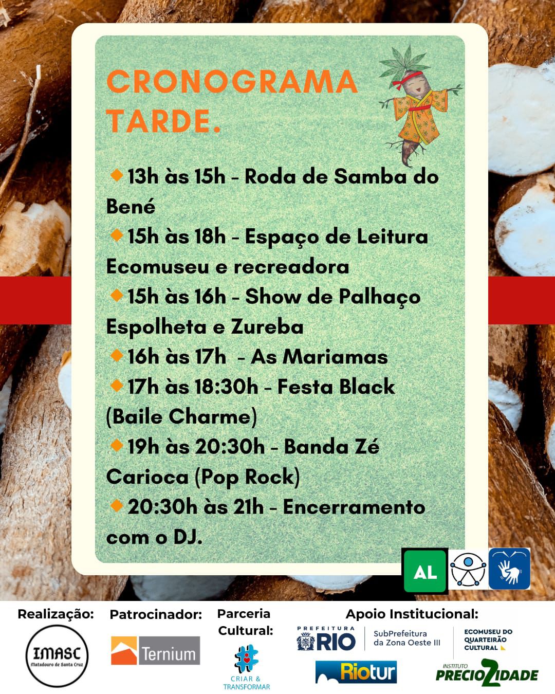 O Imasc – Instituto Matadouro Santa Cruz – convida o publico da Zona Oeste, em particular o santacruzense, para a primeira ‘Festa do Aipim de Santa Cruz”. O evento acontecerá no próximo domingo (07.12), à partir das 09:00, na Praça Ruão, 35, em frente ao Batalhão Villagran Cabrita, próximo ao quartel do Corpo de Bombeiros, com entrada franca.